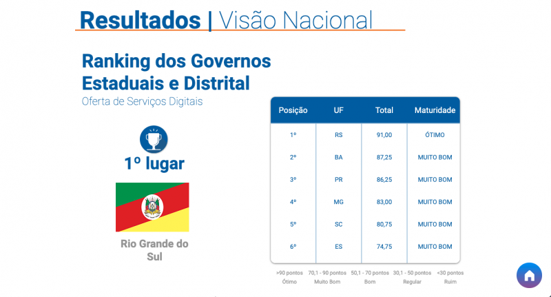 De acordo com o Ranking dos Governos Estaduais e Distrital, o RS conquistou 91 pontos, se tornando o único Estado enquadrado no nível ótimo da escala de maturidade apresentada pelo indicador. Bahia e Paraná, que conquistaram segundo e terceiro lugares, respectivamente, foram considerados muito bons nos quesitos avaliados.